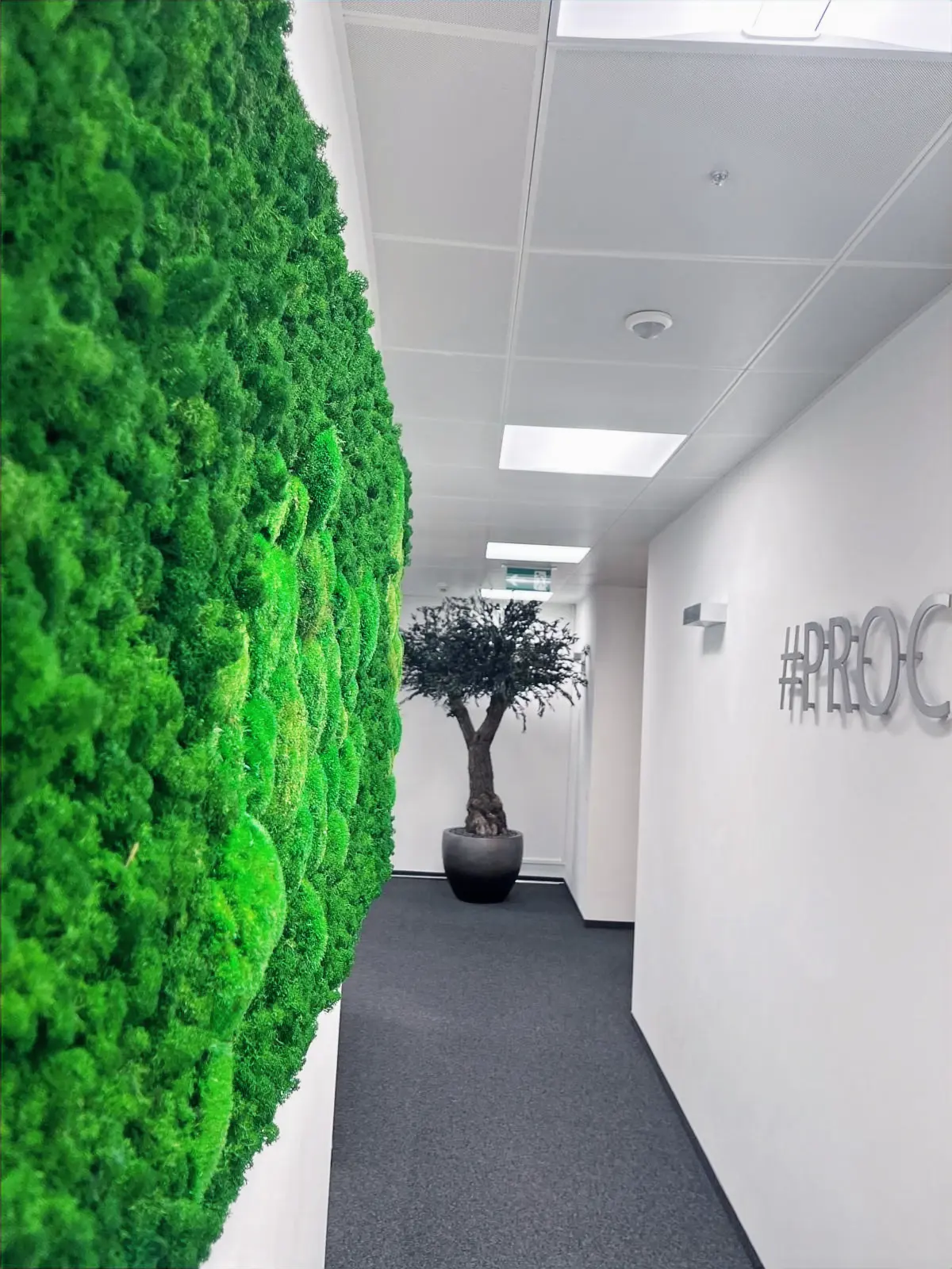 1. Design of the Wall: The design of the wall was customized according to the client’s wishes and the aesthetics of the offices. The stabilized ball moss was arranged to create an interesting relief and a play of soothing colors.