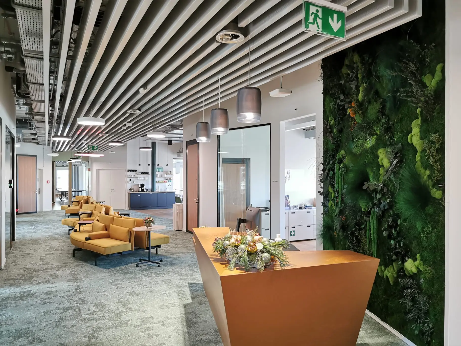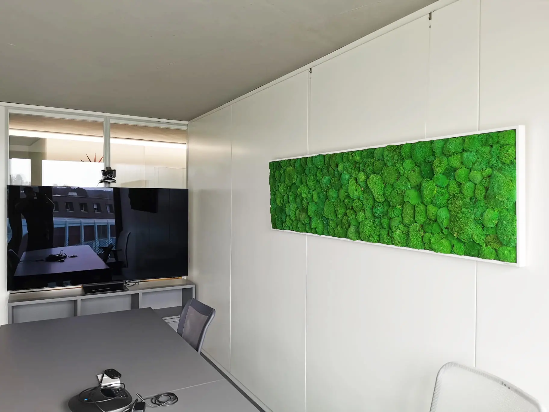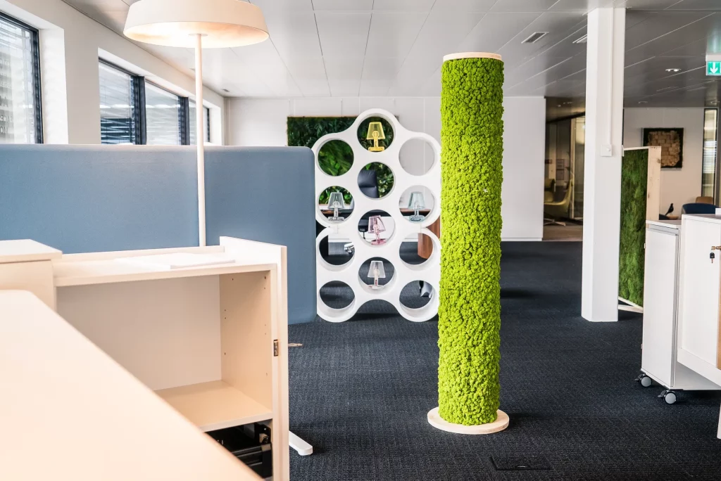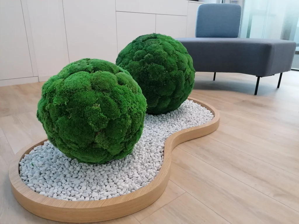 La mousse boule ainsi que les autres feuillages présents sur le mur végétal stabilisé vont étouffer partiellement les sons et diminuer les nuisances sonores. Plus il y aura de mousse, plus l’absorption sera importante. D’autres matières comme le lichen stabilisé font également office d’isolant. Résultat : les collaborateurs peuvent travailler en toute tranquillité.