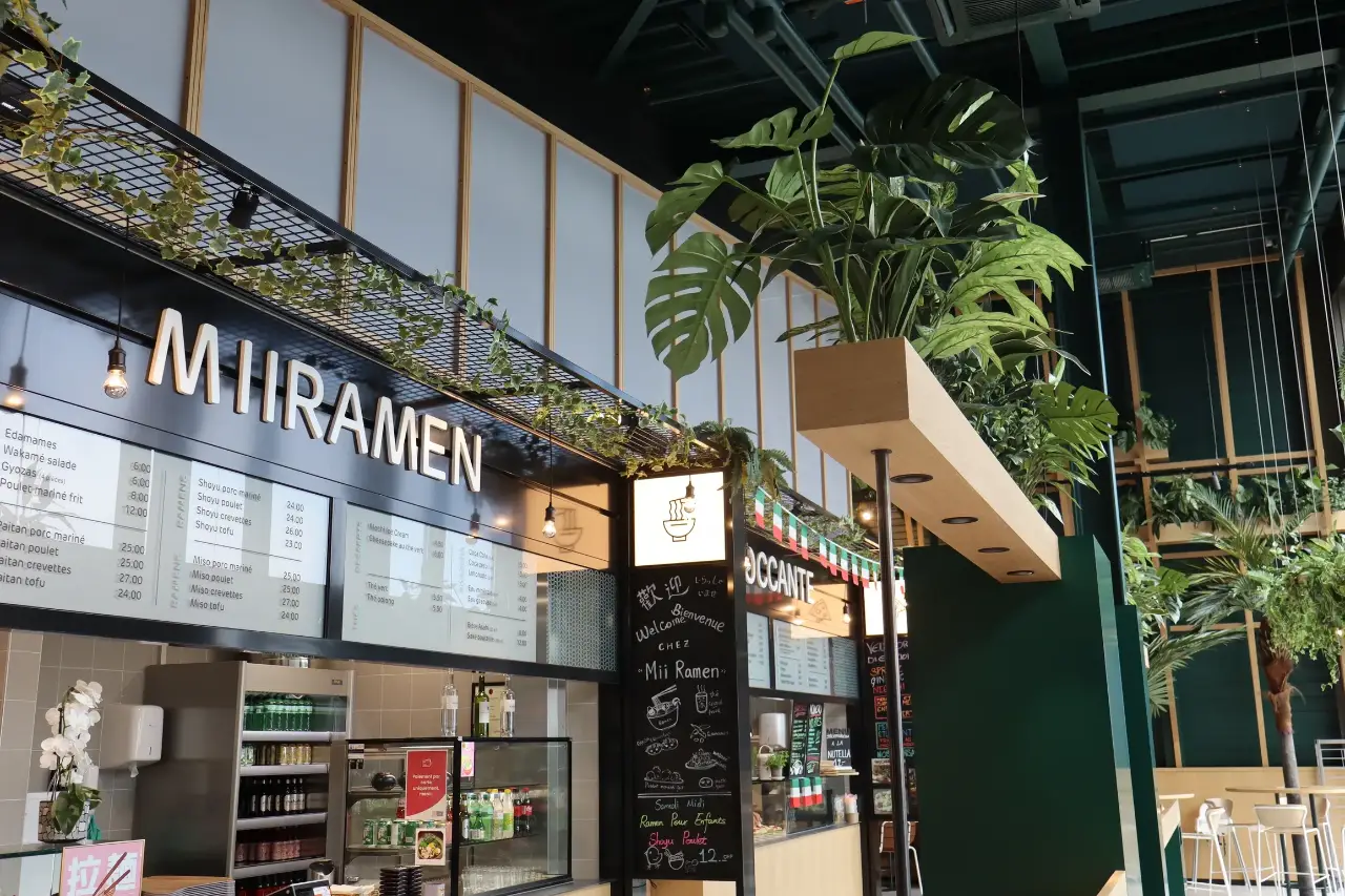 Au Sunset Gym, nous avons conçu un mur végétal stabilisé surmonté du logo lumineux, véritable symbole d’énergie et de vitalité, complété par un plafond végétal artificiel qui plonge les sportifs dans une atmosphère immersive. Chez Esonova, lieu dédié au bien-être holistique, l’installation de plantes stabilisées et artificielles a créé une oasis propice à la sérénité. Enfin, au Geneva Food Court, en collaboration avec TheBrandstorm, nous avons intégré une végétation artificielle traitée feu, pensée pour conjuguer sécurité, esthétique et convivialité.