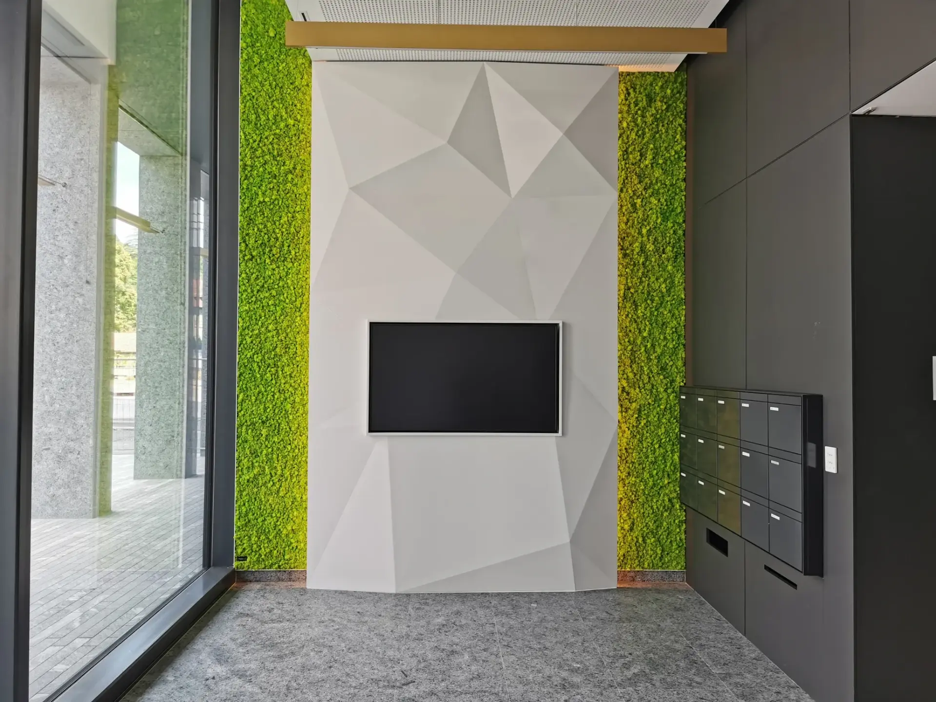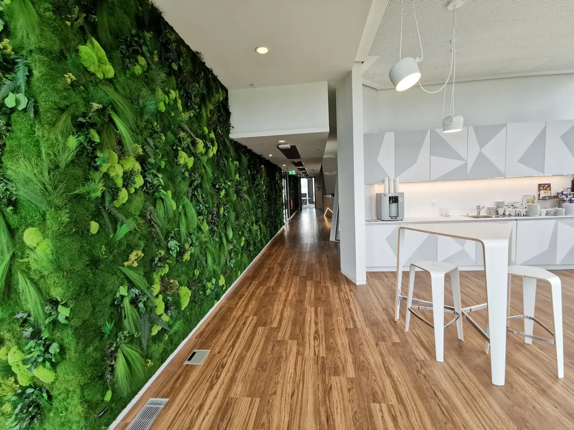 Dans le quartier Pont Rouge à Genève, Végétal Tendance a réalisé une végétalisation intérieure d’envergure pour un ensemble de bureaux administratifs. Le parti pris : installer plusieurs murs végétaux stabilisés, stratégiquement positionnés dans les zones de circulation, les couloirs, les salles de pause et de réunion, afin de maximiser l’impact visuel et acoustique.